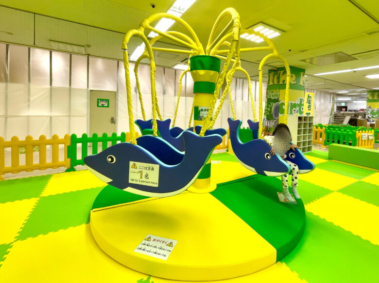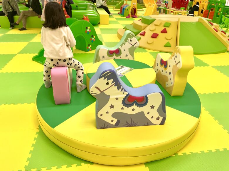 受付から見えるのは回転遊具のイルカさんとお馬さん!