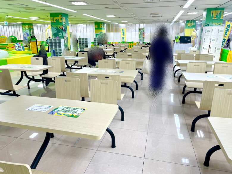 飲食物の持ち込みがOKになっていて、施設内にはテーブル席もずらりと並んでいます。